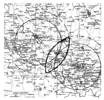 Na rysunku: Stacja A pod Oławą k/Wrocławia, Stacja B w Katowicach. Przy zasięgach stacji 75 km, zasięgi są styczne, natomiast powiększone do 100 km tworzą strefę wspólną w której leży Opole, Kluczbork i Prudnik. Linia ciągła wyznacza zasięg 75 km, a linia przerywana zasięg 100km.