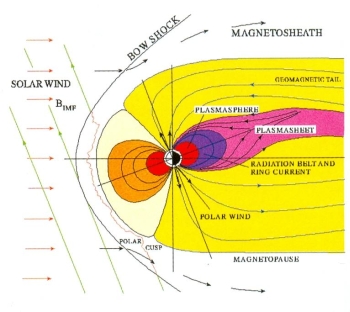 Na rysunku: Ziemia pod wpływem wiatru słonecznego.
