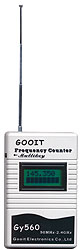 • GY-560 - bezprzewodowy miernik częstotliwości W Interneciej można nabyć bezprzewodowy miernik częstotliwości firmy GOOIT model GY-560 o szerokim zakresie pomiarowym od 50 MHz do 2400 MHz. Sygnał pomiarowy jest odbierany za pośrednictwem wbudowanej anteny teleskopowej (wystarczy ustawić mierniki w pobliży anteny nadawczej, by odczytać wartość częstotliwości emitowanego sygnału radiowego). Miernik nadaje się do kontroli różnego rodzaju nadajników radiowych pracujących w zakresie VHF, UHF. Podczas prób miernik bez problemu mierzył częstotliwości także radiotelefonu CB (27 MHz). Jak na kieszonkowe wymiary miernik ma wystarczającą stabilność częstotliwości. Zasilanie urządzenia odbywa się z wewnętrznej baterii 6F22. Na czytelnym i podświetlanym 7-cyfrowym wyświetlaczu LCD jest także wskaźnik siły mierzonego sygnału oraz wskaźnik poziomu baterii. Urządzenie jest wyposażone w automatyczny wyłącznik zasilania, a sterowanie funkcjami odbywa się za pomocą jednego przycisku Multikey. Podstawowe parametry GY-560: - zakres pomiaru: 50 MHz – 2,4 GHz - zasilanie: bateria 9 V - kolor: szary - wymiary: 9,4 × 5,7 × 2,3 cm - waga: 112 g