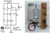 Artykuł ten nie będzie dotyczył ani problematyki politycznej, ani audycji podziemnego "Radia Solidarność". Tematyka ta została już chyba dość wyczerpująco omówiona w wielu publikacjach i przedstawiona na wystawach i w muzeach. Chyba prawie wszyscy znają już z fotografii lub z wystaw (np. organizowanych przez IPN) sporej mocy amerykańskie przenośne nadajniki na pasmo OIRT oraz tropione przez SB niewielkie samoobsługowe stacje nadawcze, rozmieszczane na dachach wieżowców. Ale były też nielegalne stacje, których "służby" zbyt gorliwie nie tropiły, choć zazwyczaj dobrze wiedziały o fakcie ich istnienia (...) Przyszedł 13 grudnia 1981 r. W radiowym eterze UKF – cisza. W telewizji zaśnieżony obraz ze smutnym spikerem w szarym mundurze na szarym tle (czarno-biały telewizor) i wiszące w powietrzu koło jego głowy równie smętne jak on logo "dt". Toteż wielkie było moje zdziwienie, gdy pewnego dnia na częstotliwości ok. 67 MHz usłyszałem niesłyszaną dawno muzykę rozrywkową z wielką ilością wysokich tonów. I to non stop w stereo (nawet 10 lat później nie wszystkie stacje radiowe dawały słuchaczom taki luksus – przykładem niech będzie Program III PR nadawany z Chwaszczyna, który mało, że był nadawany w mono, to przez długie lata pasmo częstotliwości akustycznych miał ograniczone do 7kHz). Przez trzy godziny żadnej "wrony". Tylko muzyka, i to niezła. Zacząłem codziennie słuchać tej rozgłośni, która w końcu "przemówiła". Okazało się, że jest to "pirat", rozmawiający w dupleksie z drugim sobie podobnym osobnikiem, którego sygnał też znalazłem na skali, kilka megaherców wyżej. Tamten był dużo bardziej leniwy, bo muzyki puszczać nie chciał, tylko "pogadywał". Potem pokazał się trzeci, też niechętny do puszczania muzyki. Dałem sobie spokój ze słuchaniem głupawych zazwyczaj pogawędek i przełączyłem się z powrotem na "główną" rozgłośnię. Coś jednak nie dawało mi spokoju. Głos "pirata" z tej rozgłośni. W pewnym momencie skojarzyłem – przecież to K., muzyka leci pewnie z jego podrasowanego MK-125, a nadajnik sam sobie zrobił. Wizyta u niego potwierdziła moje przypuszczenia. Żeby nie być gorszym, skonstruowałem na podstawie zdobytego gdzieś schematu mój pierwszy mininadajnik na pasmo UKF-OIRT (fot. 1). Wystarczy spojrzeć na schemat, aby stwierdzić, że była to konstrukcja, przeznaczona do nadawania raczej emisją AM niż FM, choć w praktyce generowała i jedno, i drugie. Dewiacja była wystarczająco szeroka, pasożytnicza modulacja amplitudy nie przeszkadzała w odbiorze nadawanego sygnału, miliwatowa moc urządzenia nie powodowała większych "spustoszeń" w paśmie OIRT w okolicy, czegóż chcieć więcej? K. poradził mi, aby w celu zwiększenia zasięgu zastosować ćwierćfalową antenę i postawić ją na dachu, tak jak on to już wcześniej uczynił. Do budowy naszych anten posłużyły ogólnie dostępne i tanie pręty do anten samochodowych, dopasowane do pracy w paśmie 66-73 MHz. Montując mininadajnik z fot. 1. do radiodbiornika "Asia" (MOT-757, prod. Eltra), skonstruowałem "transceiver dupleksowy", którego zasięg w łączności z anteną bazową nie przekraczał 50m, toteż jego zastosowanie ograniczyło się (na szczęście) do kilku prób łączności na małą odległość. Kilka następnych nadajniczków porozdawałem kolegom z klasy, załączając instrukcję montażu ewentualnej anteny i gniazda mikrofonowego. Brzmi to nieciekawie – piractwo i namawianie do piractwa, ale na szczęście okazało się, że tylko jeden kolega zainteresował się tym na serio. Zaczął odtwarzać różne nagrania i bez przerwy gadał i śpiewał do mikrofonu. Po kilku tygodniach, nieco przerażony jego "ekspresją", zabrałem mu nadajniczek pod pretekstem, że jest mi potrzebny...