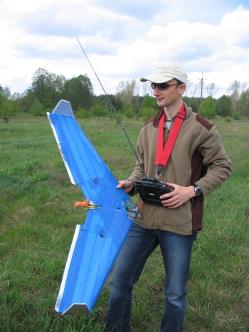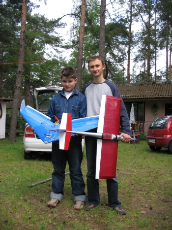 Na zdjęciu: Grzegorz SP5EIN ze swoimi modelami sterowanymi radiem (po prawo trzyma spalinowego Diablotina; po lewo Antek trzyma latające skrzydło).