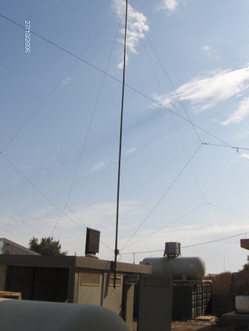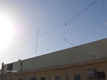 Jedna ramka została ukierunkowana w stronę Europy i USA, a druga w kierunku Japonii i Dalekiego Wschodu. Całość umieściłem na starym nieczynnym transformatorze wysokiego napięcia ok. 3m nad gruntem . Usytuowanie jej tuż nad ziemią nie było możliwe ze względu na często przechodzących tam ludzi. Odbiór na niższych pasmach bardzo wyraźnie uległ poprawie. Najlepiej sprawowała się w pasmach 160m, 80m, w paśmie 40m w zależności od propagacji odbierałem na verticalu GP-7 lub na K9AY. Następnego dnia zamocowałem beverage 89 m (wykonany także z kabla telefonicznego, a ukierunkowany na Japonię). Pierwsze 20m anteny umieszczone były ok. 0,5m nad ziemią, pozostała część spoczywała na gruncie. Była bardzo przydatna przy otwarciach propagacyjnych w kierunku Japonii w pasmach 160m, 80m. Z moich obserwacji wynikało, że w zależności od kąta pod jakim docierał sygnał, raz lepsza okazywała się K9AY, a innym razem beverage. Podczas pierwszego pobytu w Iraku (lipiec 2004-luty 2005 r.) kable koncentryczne zmieniałem ręcznie, teraz postanowiłem nie powtarzać tego błędu i GP-7: