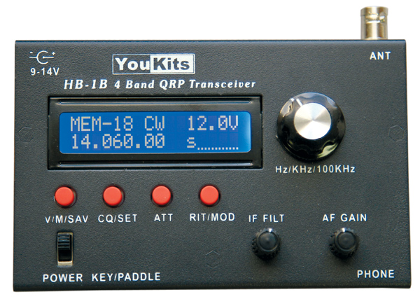 Czteropasmowy transceiver CW QRP - zwolennicy pracy telegraficznej małymi mocami powinni zwrócić uwagę na lekki i mały transceiver o wystroju bardzo podobnym do oferowanego przez Ten-Tec R4030. Produkowany przez YouKits czteropasmowuy transceiver telegraficzny HB1B, jest wyposażony tylko w niezbędne elementy regulacyjne i pracuje w pasmach 80?m (3,5–4 MHz), 40?m (7,0–7,3 MHz), 30?m (10,1–10,15 MHz), 20?m (14,0–14,35 MHz). Odbiornik pokrywa zakres 3,2–16 MHz i umożliwia odbiór sygnałów SSB i CW (nadawanie tylko CW). Na górnej części obudowy znajduje się między innymi czytelny wyświetlacz LCD informujący o aktualnej częstotliwości pracy, trybie zasilania i innych udogodnieniach (S-metr, RIT), dwa pokrętła (strojenie, siła głosu), gniazdo antenowe BNC. Moc nadajnika, jak na QRP przystało osiąga 5 W, a czułość odbiornika jest typowa i wynosi około 0,8 uV (MDS 0,2 uV). Urządzenie jest wyposażone syntezer częstotliowści DDS z łatwą regulacją kroku strojenia zarówno częstotliwości amatorskich jak i ogólne dostępnych zakresów HF oraz pamięć umożliwiającą zapamiętanie 20 wartości częstotliwości. W układzie odbiornika znajduje się czterokwarcowy filtr drabinkowy z możliwością regulacji szerokości pasma 2,2–1,6 kHz (SSB) lub 900–400 Hz (CW). Wewnątrz obudowy są uchwyty do włożenia baterii alkalicznych (8×AA) umożliwiających zasilanie urządzenia w podróży, a gniazdo w tylnej części obudowy zapewnia doprowadzenie zewnętrznego zasilania w zakresie 12–14 V np. z akumulatora samochodowego (dostępny jest także opcjonalny akumulator litowy R9411). Pobór prądu podczas odbioru wynosi około 55 mA, a nadawaniu od 550 mA do 950 mA, w zależności od napięcia zasilania. Do zewnętrznego gniazda można podłączyć manipulator klucza telegraficznego lub zwykły klucz sztorcowy. Wewnętrzny układ umożliwia nadawanie automatyczne CQ łącznie z ustawionym sygnałem wywoławczym z pamięci. Z kolei do wyjścia słuchawkowego można podłączyć zewnętrzny głośnik 8 ? lub dowolne słuchawki.