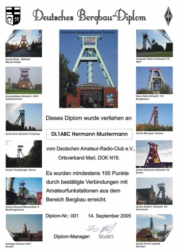 Oddział terenowy DARC w Marl, DOK N 19, wydaje dyplom "Deutsches Bergbau" za łączności wykonane po 1 stycznia 2006 roku z różnymi stacjami z dziedziny górnictwa, zarówno dla nadawców jak i nasłuchowców. ...