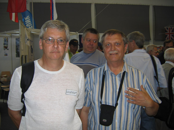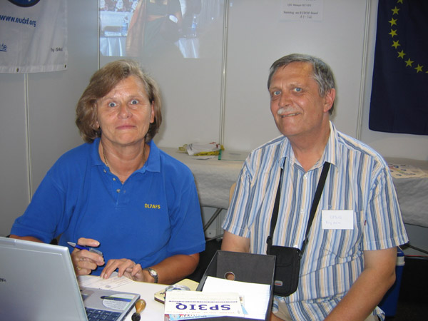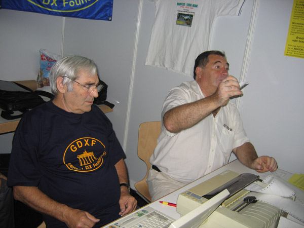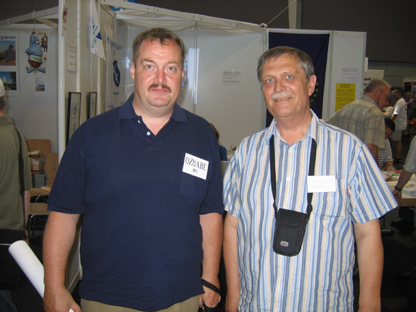 W bezpośredniej odległości na stoisku Sigiego DL7DF uczestnicy wyprawy na Andamany VU4 wystawiali karty QSL. Na zdjęciu Sigi DL7DF i Jurek SP3GEM.